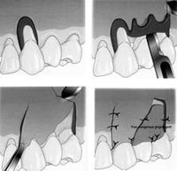 - Đây có thể là vạt xoay hoặc vạt đẩy. Nguyên tắc là dùng phần mềm ở bên cạnh che phủ chân răng bị hở. Phương pháp phẫu thuật được minh họa (xem hình trên).