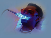Tất cả các răng được chiếu ánh sáng laser, ánh sáng laser có khả năng kích hoạt tăng tác dụng khử màu của thuốc tẩy răng. Thời gian bệnh nhân ngồi trên ghế lâu hay mau tùy thuộc vào mức độ sẫm màu của răng, thường từ 30 phút đến 1 giờ. Đây là phương pháp làm trắng răng hiệu quả nhất, bệnh nhân chỉ cần đến một lần nhưng chi phí cao hơn các phương pháp làm trắng răng khác.