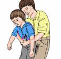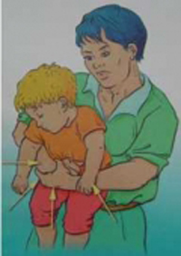 Quý phụ huynh khi gặp trường hợp tương tự cần bình tĩnh và làm thủ thuật đúng để giúp trẻ tống dị vật ra ngoài. Đối với trẻ lớn, ta đứng sau lưng vòng tay ôm qua người trẻ, sau đó dùng nắm tay ấn nhanh và mạnh vào vùng trên của bụng trẻ ngay dưới mũi xương ức . Đối với trẻ nhỏ, ta cho trẻ nằm sấp đầu hơi chúi thấp và vỗ mạnh vào lưng trẻ